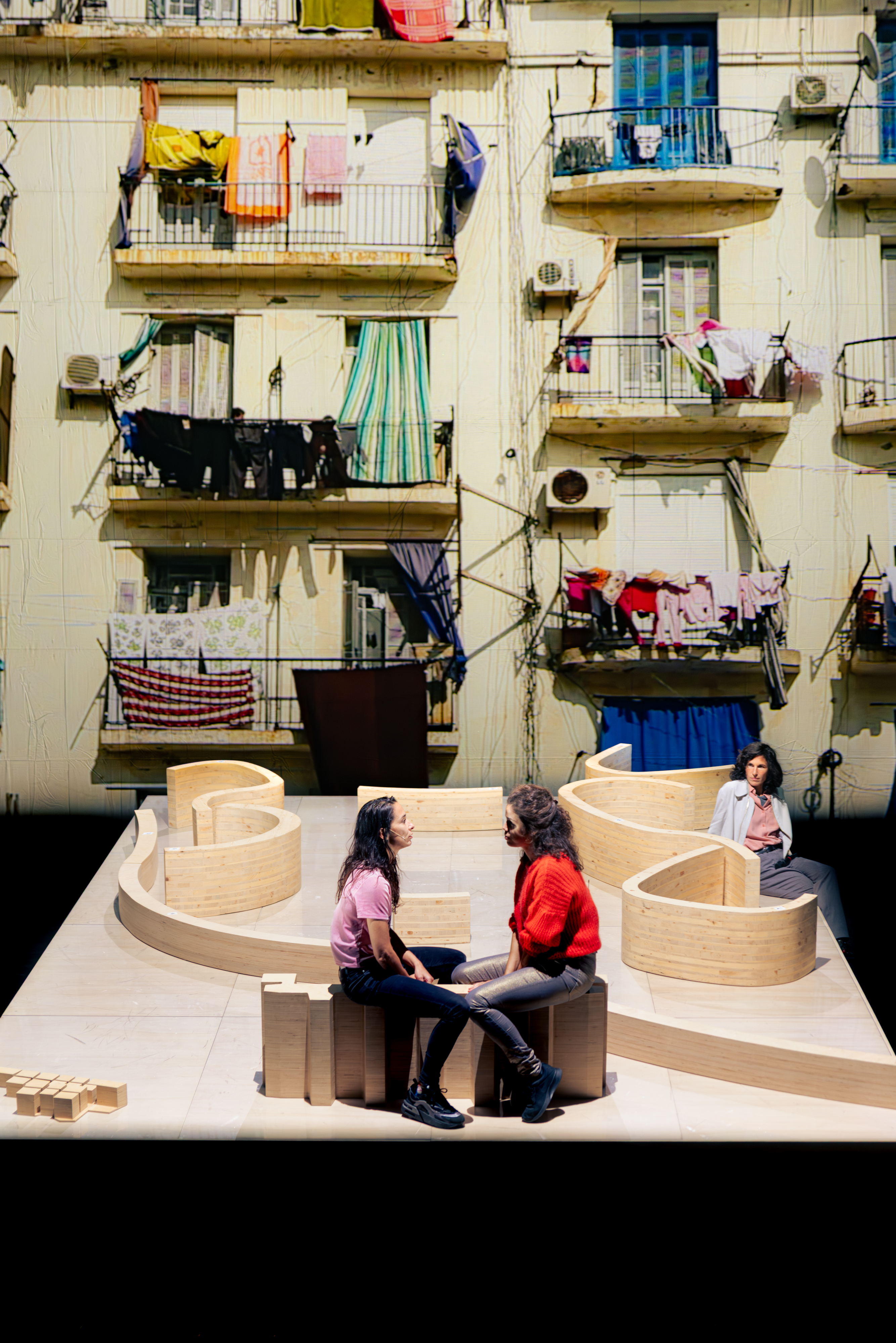 Entre un gratte-ciel et une autoroute aérienne, des personnages ensauvagés racontent, dansent, se battent et s’essoufflent au rythme d’une course effrénée et suspendue à travers l’histoire contemporaine d’une ville manifeste, Alger, revue et corrigée par Le Corbusier. Une ville dystopique se superpose au réel. Dans cette œuvre chorale consacrée à l’Algérie contemporaine, l’écrivaine et poétesse Sonia Chiambretto poursuit sa démarche singulière de collecte de témoignages et documents d’archives qu’elle façonne en une langue brute et musicale. Plus qu’un portrait, ce travail se présente davantage comme une superposition de couches de mémoire. Il y est question de la décennie noire (1990-2000), des événements de la guerre civile (1957 à 1962), mais également de demain. Le désir fou d’un avenir meilleur y est très sensible. À l’opposé de tout didactisme, transparait une pensée en mouvement, un profond questionnement.